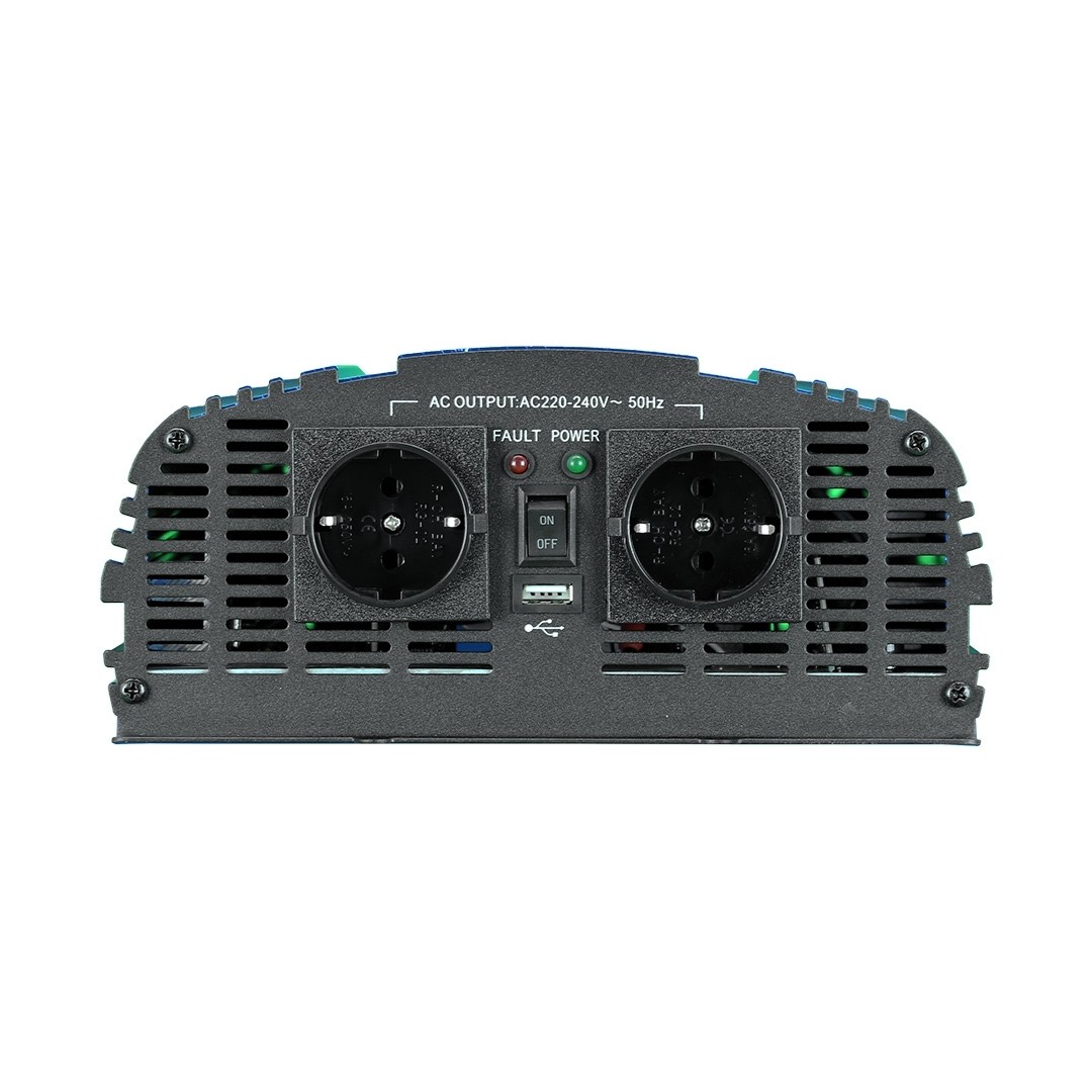 Tommatech MS-1500 – прост в пользовании и на основе качественных компонентов инвертор напряжения номинальной мощности 1500 Ватт и пиковой 3000ВА. Отдтчительная особенность присутствие на борту 6 предохранителей. Инвертор предназначен для качественного преобразования напряжения с 12 на 220 Вольт. Аппроксимированный синусоидальный тип выходной волны подходит для большинства электронных нагрузок. Модель предусматривает комплекс защиты от ряда моментов возникающих в работе. Так предусмотрена высокоэффективная защита Tommatech MS-1500 от перенапряжения, перегрузки, от короткого замыкания, от обратной полярности и перегрева. Имеет место сигнализатор об низком заряде батареи. Функция медленного старта. Среды интерфейсов Tommatech MS-1500 две розетки Schuko, выходной порт USB. На борту клеммные провода.