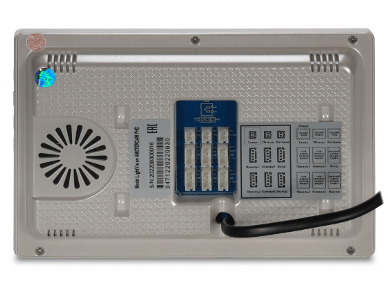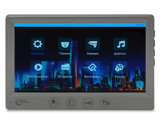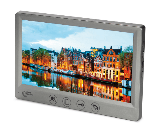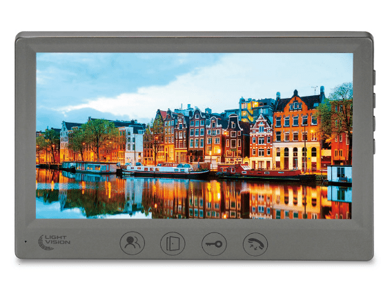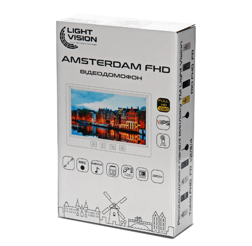 LightVision Amsterdam FHD – яркий представитель видеодомофонов с огромным цветным семи дюймовым IPS дисплеем (1024х600 пикселей), адресным интеркомом (на 6 мониторов) и мультиформатностью работы. Так модель рассчитана на входной сигнал AHD/TVI/CVI (720Р/1080Р) типа. Всего одновременно домофон работает с двумя панелями вызова и двумя камерами видеонаблюдения. Управление комфортное при помощи механических и сенсорных кнопок. Под хранение материала на борту домофона имеется слот под подключение SD карточки памяти с объемом не более 128 гигабайтов. Реализованы функции переадресации, голосовые сообщения, часы, фоторамки. В дополнение идет интегрированный MP3-плеер. В дополнение на борту N/O выход для дополнительного замка (ворот). Монтаж LightVision Amsterdam FHD производится на стену. Впечатляет тонкость пластикового корпуса в сочетании с привлекательным дизайном. Цвет корпуса серый. Размеры LightVision Amsterdam FHD: 175х115х20 миллиметров. Питание на выбор от 220 или 12 Вольт.