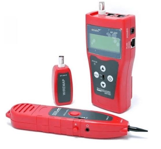 Tcom NF-308 – многофункциональный тестер-трассоискатель с LCD дисплеем с подсветкой на борту. Модель состоит из трех частей (приемник, термодатчик, передатчик) и успешно применяется для коаксиал кабеля, телефонного кабеля, витой пары, а также USB кабеля. Успех тестирования достижим для витой пары большой длины вплоть до 305 метров. Обнаружение же передачи сигнала достижимо вплоть до 2 километров. Питание здесь автономное от двух батареек популярного типоразмера крона. В случае низкого заряда батарей подается соответствующая индикация. Для звукового оповещения предлагаются два настраиваемых тона. Комфорт пользования Tcom NF-308 повышен возможностью подключения наушников.