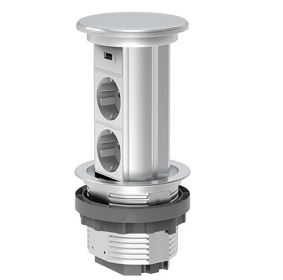Выдвижной розеточный блок Livolo применяется для установки в столах. Имеет степень защиты IP44, изготовлен из металла с покрытием специальной краской. Это хороший вариант, установить скрытые розетки, который может быть использован для установки на кухне, на рабочих местах в офисе или же в конференц-залах. Поднимается и опускается вручную.