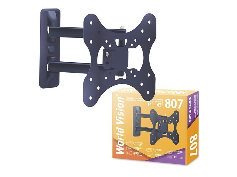 World Vision 807 – прочный стальной кронштейн для надежного настенного крепежа телевизор с диагональю от 14 до 42 дюймов и весом не более 30 килограммов. Кронштейн соответствует стандартам VESA до 200 на 200 миллиметров. Кронштейн допускает регулировку наклоном и поворотом на 15 градусов. Цвет черный.