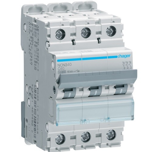 Hager NCN340 – отвечающий высоким стандартам качества модульный автоматически выключатель серии N на 3 полюса от всемирно известной торговой марки Hager. Модель идет с номинальным током 40 Амперов и характеристикой срабатывания расцепителя C. Расчетное напряжение 380 Вольт, отключающая способность 10kA. Нейтральное положение: без нейтрали. Все компоненты выключателя исключительно высокого качества, отчего срок механической износоустойчивости достигает потрясающей отметки в 20 000 циклов.