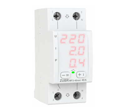Zubr MF2-40 – отвечающее высоким стандартам качества электромагнитное многофункциональное реле напряжения с индикатором напряжения, тока, мощности для эффективной защиты оборудования от значительных колебаний напряжения в однофазной сети 230 Вольт. Также реле предусматриваетзащиту от превышениятока и активной мощности. В ситуации с аварийной ситуацией реле отключает нагрузку. На борту термозащита, TrueRMS, Номинальный ток нагрузки Zubr MF2-40 равен 40-ка Амперам, максимальный же на протяжении 10-ти минут допустим до 50-ти Амперов. Номинальная мощность нагрузки 8800 ВА.