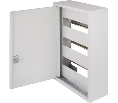 E.next e.mbox.stand.n.36.z – прочный металлический распределительный шкаф под навесной монтаж. Шкаф рассчитан на 36 модулей, размещаемых в три ряда. Под ввод кабеля в нижней части выделено три отверстия диаметром каждого 24 миллиметра. Дверца закрывается на надежный замок. Корпус из стального листа в толщине 0,5 миллиметра, соответствует уровню герметичности IP30. Размеры: 505x280x135 миллиметров. Комплект поставки включает в себя два ключа и DIN рейку.