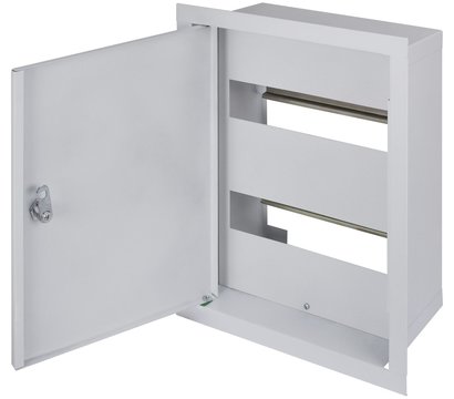 E.next e.mbox.stand.w.24.z – прочный металлический встраиваемый шкаф с замком под 24 модуля. Уровень герметичности шкафа: IP30. Размер встройки: 293x130 миллиметров.