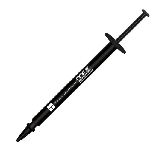 Термопаста Thermalright TF8 1,2гр.(13.8 Вт/мК), шприц, серая Термопаста Arctic Thermalright используется для улучшения теплопередачи между нагревательным блоком и радиатором видеокарт, карт памяти и процессорах. Упакована в шприц, что позволяет дозировать нанесение термопасты.