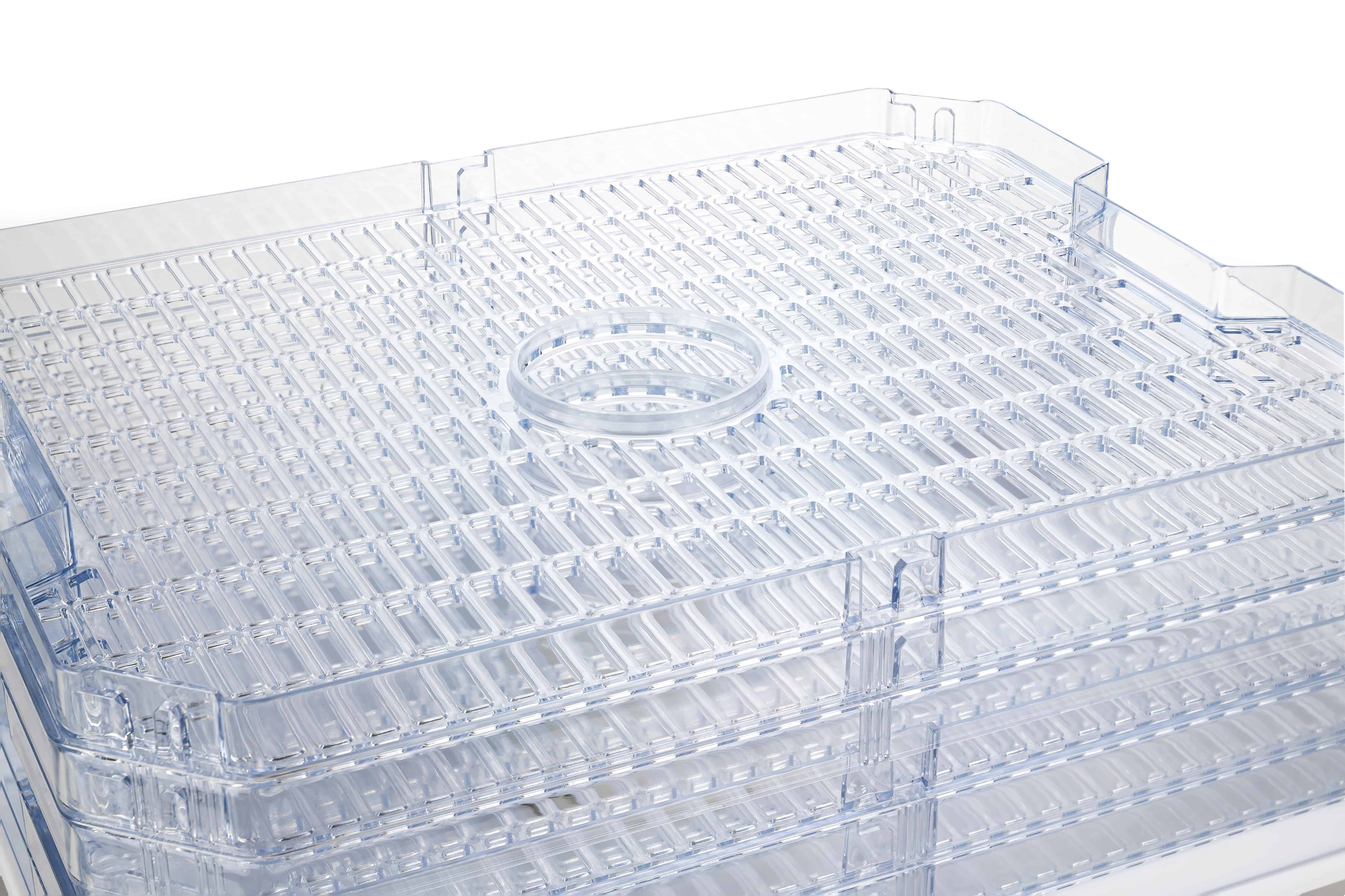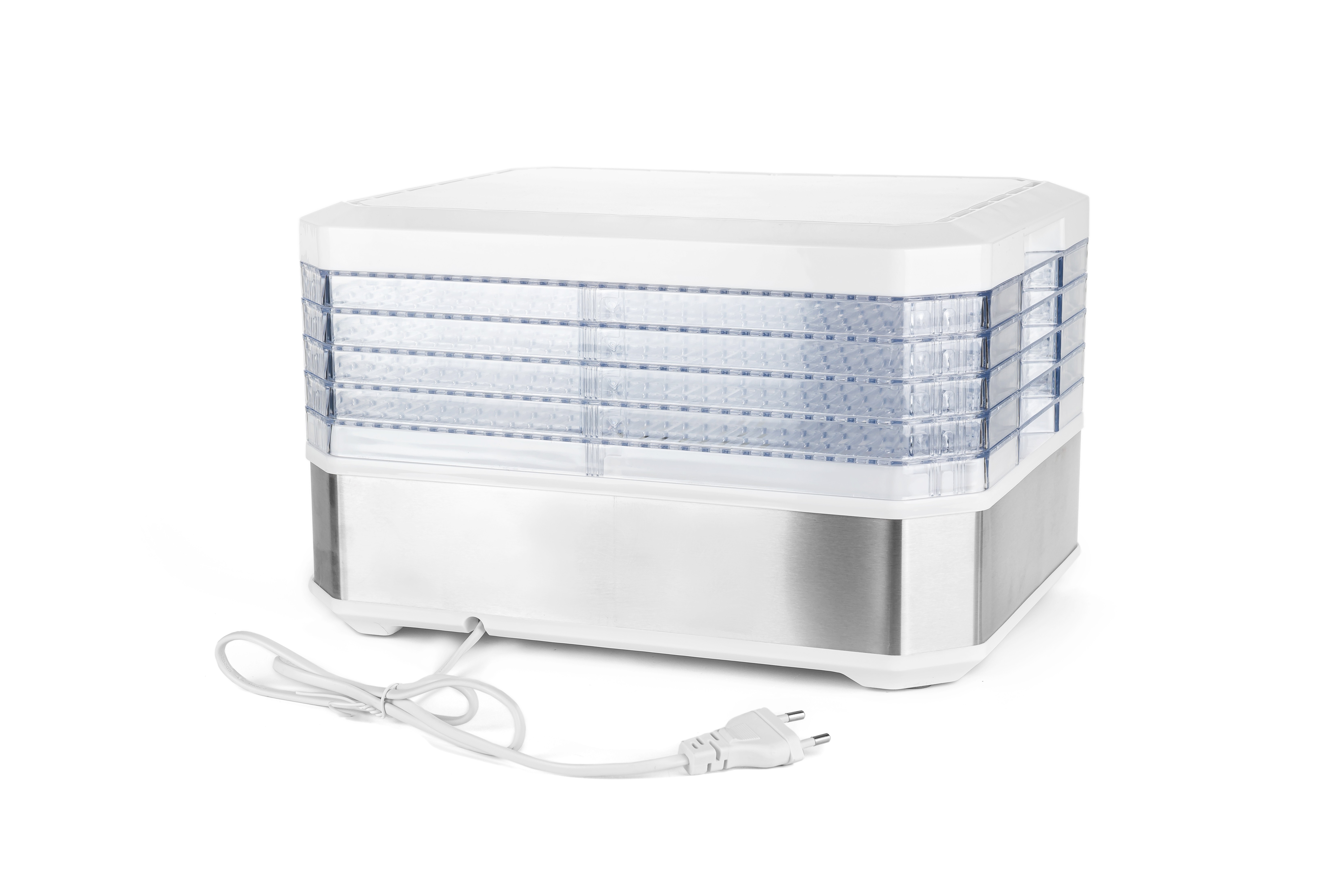 Сушилка имеет 5 сушильных поддонов диаметром 38 см и высотой 2 см, что позволяет сушить большое количество продуктов за один раз. Прямоугольная форма изделия позволяет размещать продукты эффективно, обеспечивая оптимальное использование пространства.
