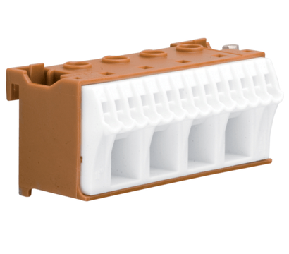 Hager KN18P – фазный клеммный блок QiuckConnect с 4 соединителями под сечение до 16-ти мм2 и 14-ю под кабель с сечением до 4 мм2. Блок изготовлен исключительно из качественных компонентов, в результате чего в долговечности сомневаться не приходиться. Состав меди в блоке равно 18 граммам. Максимально допустимая нагрузка по току составляет до 63-х Амперов. Напряжение 230 Вольт. Размеры встраивания: 34x33x75 миллиметров. Цвет коричневый.