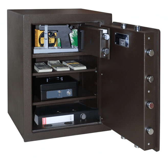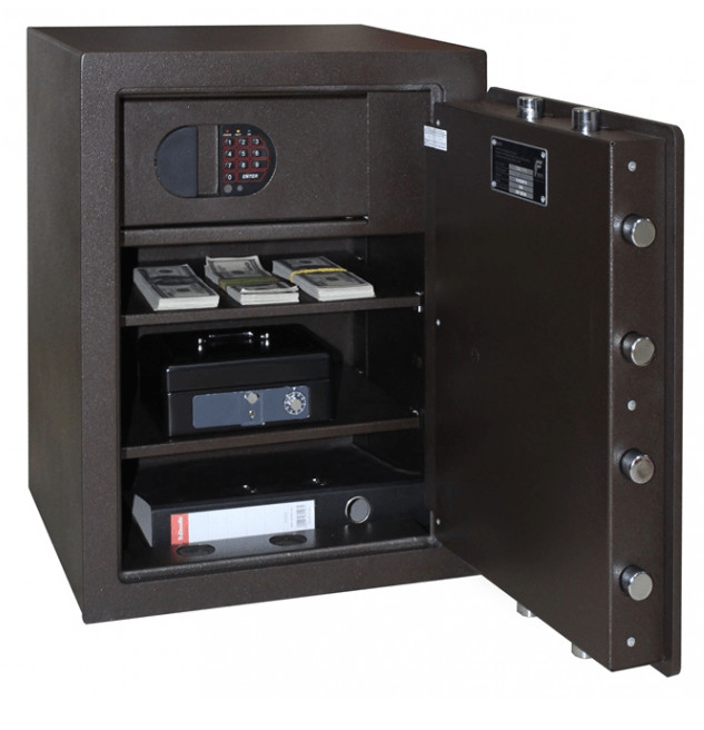 За счет двух полок емкость сейфа удается разделить на три секции. Помимо того в верхней части имеет место трейзер на электронном кодовом ключе.