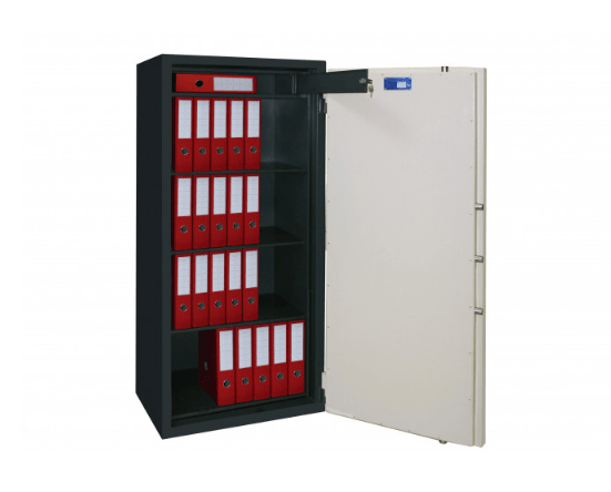 Наличие трех полок позволяет разделить емкость сейфа на 4 секции. Замком управляется ригельная трехсторонняя система, конструкция которой состоит из пяти активных вращаемых ригелей с диаметром каждого 25 миллиметров. Со стороны петель предоставлены анти срезы.