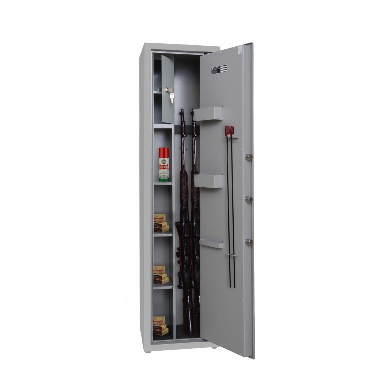 Griffon GS.140.K Grey – антивзломной конструкции (зацеп) оружейный сейф для безопасного хранения до трех стволов длиной до 1350 миллиметров. Общий внутренний объем составляет 140 литров.