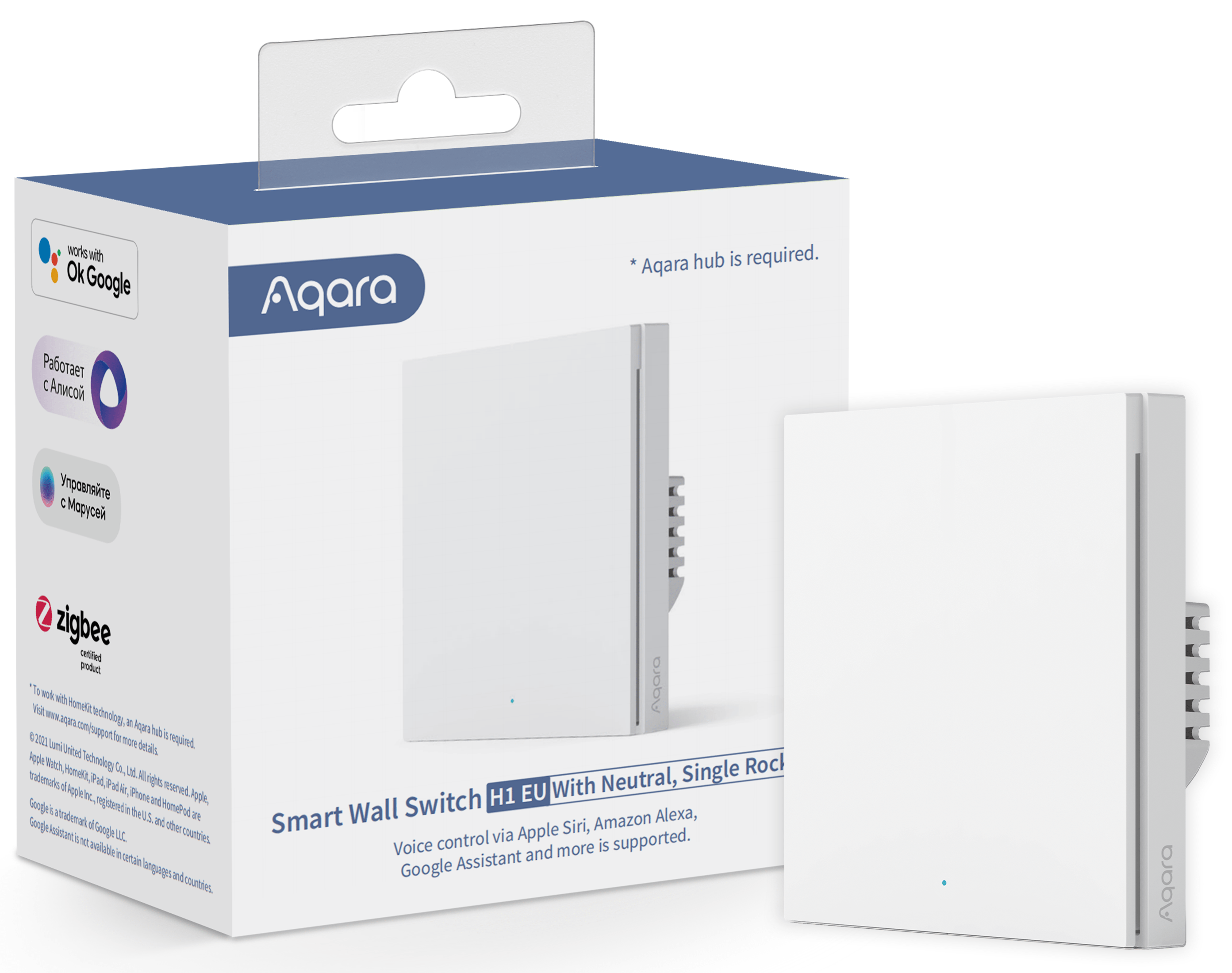 Настенный выключатель Aqara H1 (С нейтралью, одна клавиша) – это умный переключатель, работающий с помощью протокола беспроводной связи Zigbee 3.0. После связывания с Aqara HUB он может дистанционно управляться через приложение Aqara Home, имеет контроль по времени, показывает статистику питания и другие функции, а также может работать с другими умными устройствами Aqara.