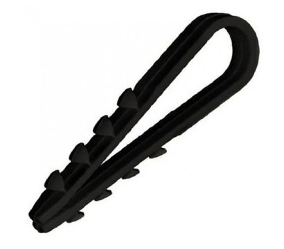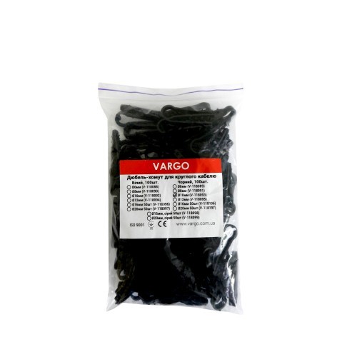 Vargo V-118091 – дюбель-хомут диаметром 8 миллиметров для надежного крепежа кабеля круглой формы. Диаметр отверстия составляет 6 миллиметров. В качестве материала использован само затухающий нейлон 66. Цвет черный. Упаковка содержит 100 штук.