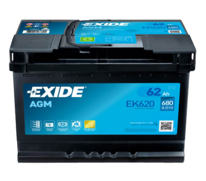 Exide EK620 – разработанный в соответствии высоким стандартам необслуживаемый AGM аккумулятор для легковых авто с номинальным напряжением 12 Вольт и емкостью 62 Ач. Пусковой ток равен 680 Амперов. Подключение нагрузки производится через клеммы расположения -/+ (обратная) Евро. Размеры корпуса аккумулятора Exide EK620: 175x190x242 миллиметра.