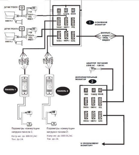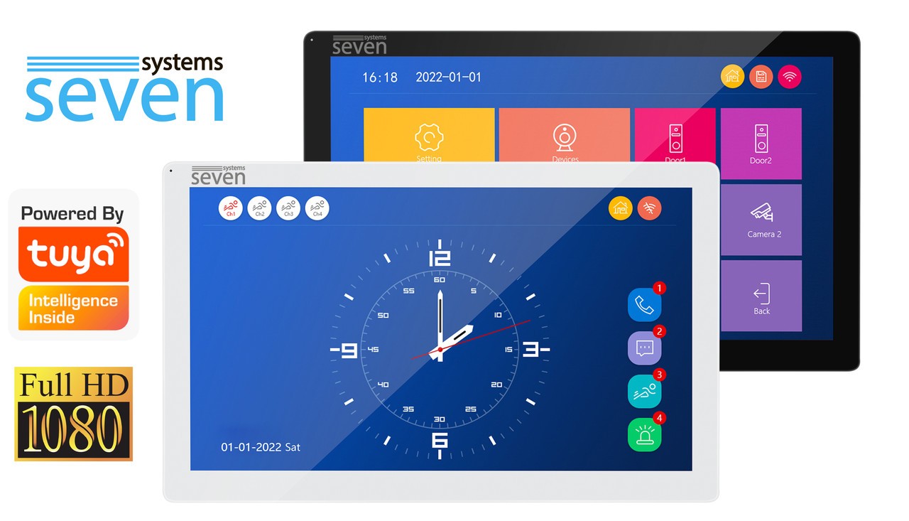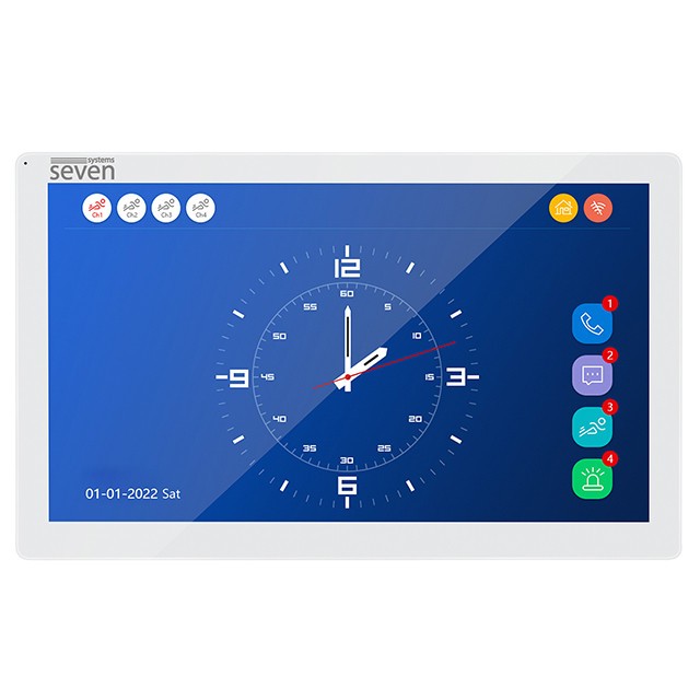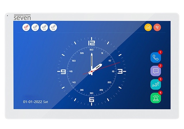 На подключение к домофону допускается до двух панелей вызова (FullHD), до двух камер (FullHD), до трех замков. В поддержке интерком на шесть внутренних мониторов. Работа с домофонами подъездного класса реализуема опционально с использованием специального адаптера Seven DA-7593.