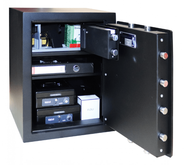 За счет двух полок емкость сейфа удается разделить на три секции. Помимо того в верхней части имеет место трейзер на электронном кодовом ключе.