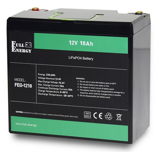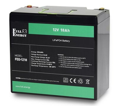 Full Energy FEG-1218 – разработанный на базе передовой LiFePO4 технологии аккумулятор с номинальным напряжением 12.8 Вольт и емкостью 18 Ач. Аккумулятор располагает комплексной защитой, увеличивающий эго срок службы, а также подключаемого оборудования. Так на высоком уровне находится защита от КЗ от перезаряда, от повышенного тока, от чрезмерного разряда.