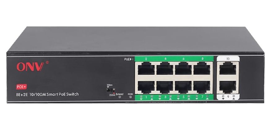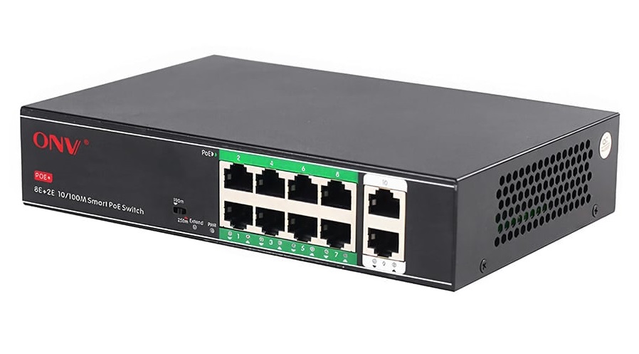 Неуправляемый свитч ONV H1108PSD переключаем в режим VLAN, где открывает увеличение расстояния пересылки питания и сигнала к отметке 250м при 10 Мбит на канал.