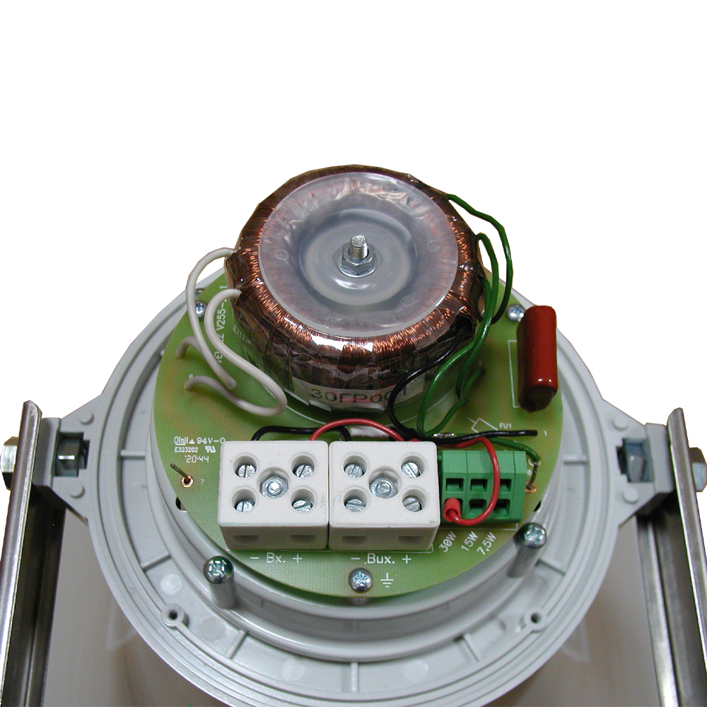 Звучание излучается при акустической мощности 121 дБ (в зоне 1 метра) и распространяется на значительную зону охвата 360° (500 Гц) и 32/39° (гор./верт., 4000 Гц). В зоне 4 метров речевое оповещение и звуковая трансляция эффективна на уровне 109 дБ. Частотный диапазон 500-8000 Гц с потрясающей разборчивостью. Трансформатор: 7.5, 15 и 30 Вт.