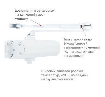 Доводчик Ryobi DS-2055V BC STD HO Glossy White хорошо себя чувствует в широком температурном диапазоне от -20 до +45 градусов по Цельсию.