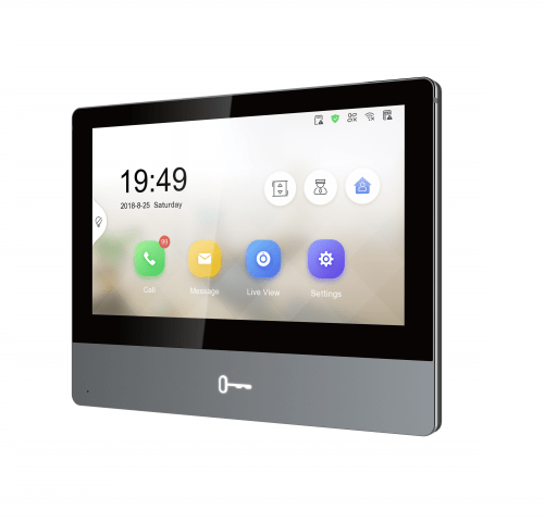 HikVision DS-KH8350-WTE1 – накладного монтажа сетевой WiFi домофон с большим семи дюймовым сенсорным IPS дисплеем и новым графическим интерфейсом на борту. В первую очередь обращает на себя внимание ультратонкий дизайн, составляющий всего 8,6 миллиметра. Дисплей может похвастаться отменной детализацией, поскольку эго разрешающая способность составляет 1024 на 600 пикселей. Также для дисплея присуща впечатляющая цветопередача. Показатель ROM и RAM равен 128 и 32 мегабайта соответственно.