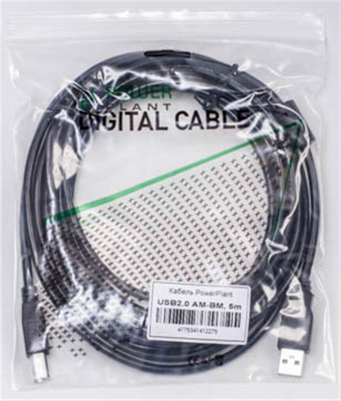 Кабель PowerPlant USB2.0(AM)-USB2.0(BM), 5м, Black, one ferrite — KD00AS1227