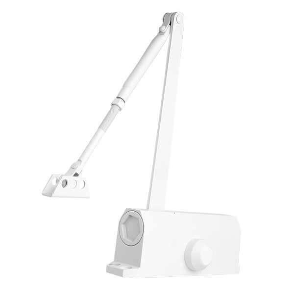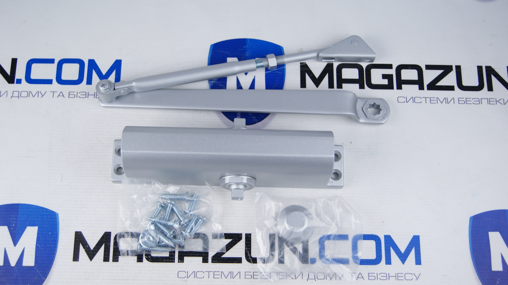 Доводчик с верхним расположением и рычажной тягой. Предназначен для установки на дверь с шириной до 950 миллиметров и весом от 45 до 65 килограмм.
