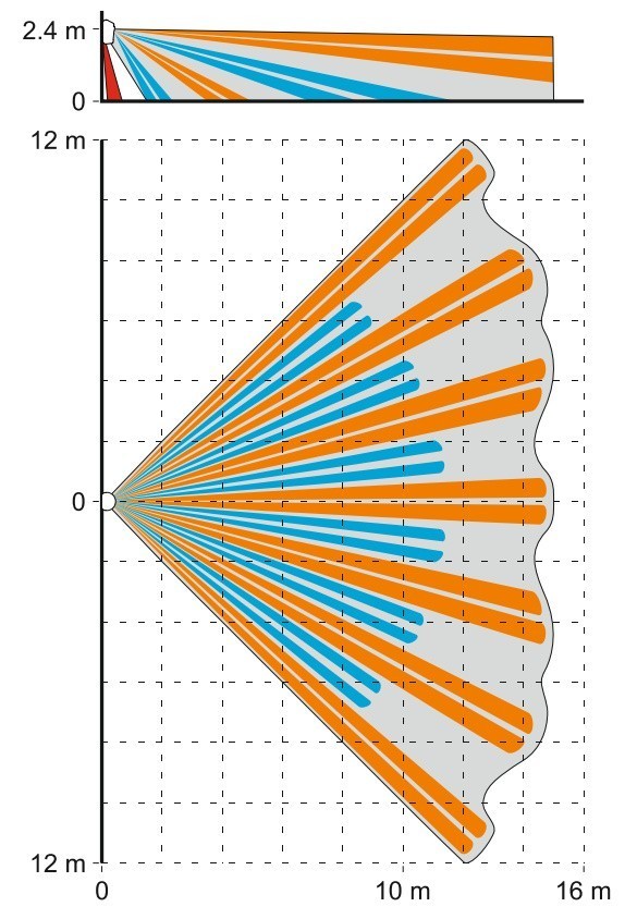 Линза здесь разработчиками предложена современная с уникальным распределение лучей. Гарантирована контролируемая зона 15 на 24 метра, угол 90 градусов. Успешному определению подлежат нарушители со скоростью движения в пределах от 0,3 до 3 метров в секунду. Зона под извещателем в зависимости от задач включается или отключается с контроля. При желании идущую линзу можно заменить на линзу типа штора или линзу типа коридор.