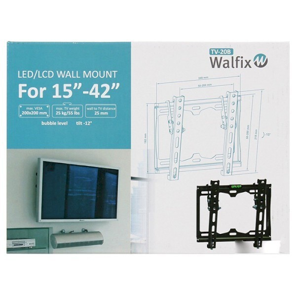 Walfix TV-20B – высоконадежный и привлекательный крепеж на настенного монтажа больших телевизоров с диагональю от 15 до 42 дюймов. Ограничение по весу составляет не более 25 килограмм. Допускается угол наклона на 12 градусов. Имеет место уровень точной установки.