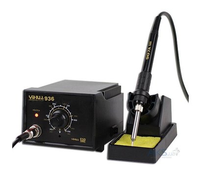 Паяльні станція Yihua 936 в комплект якої входить паяльник. За допомогою даної стації можна слегкостью проводить пайку і демонтаж різних компонентів. Паяльник Виконаний з керамічним нагрівачем. Потужність паяльника 50 Вт. У даній паяльної станції є захист високочутливих компонентів від статичного напруги.