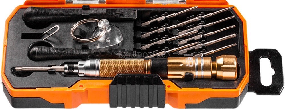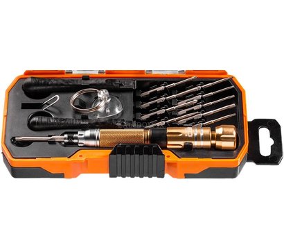 NEO Tools 06-108 - це набір для ремонту смартфонів 10 насадок для популярних моделей смартфонів. Крім того, є лопатки, що дозволяють відкривати корпус без пошкоджень, а також присоска для зручного зняття скла і поворотний тримач викруткових наконечників, що полегшує роботу. Довжина стержня 120 мм. Рукоятка виконана з якісних компонентів що дозволяє не бояться попадання масел, палива та інших елементів на її поверхню. Якість бренду NEO Tools підтверджується сертифікатом TÜV.