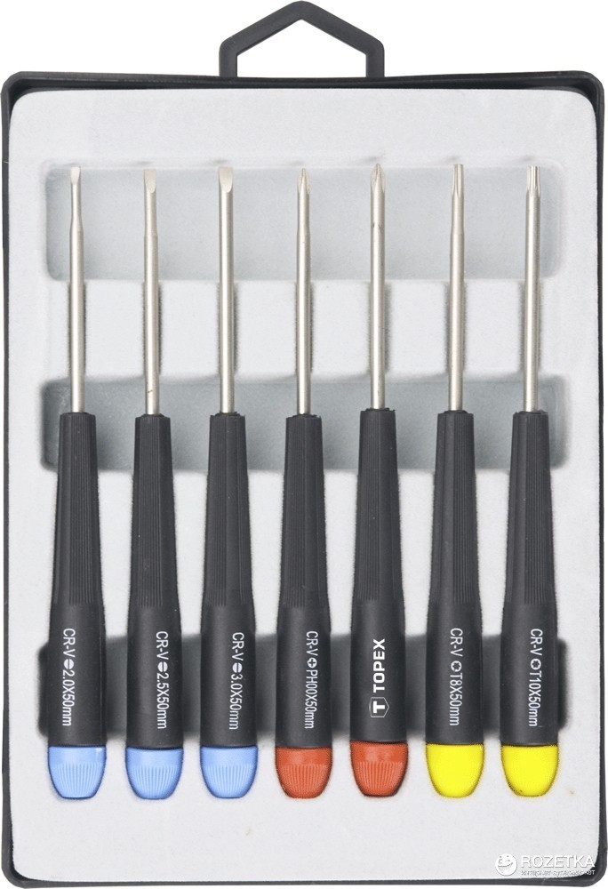 (SL / Phillips / PH / Torx) отверок довжиною стрижня 50 мм. проведена і високоміцної хромомолібденової стали. Оснащені магнітним наконечником який відповідає стандарту 56 HRC. Рукоятка виконана з якісного пластику що підвищує комфортність її використання. Якість бренду Topex підходить для домашніх майстрів.