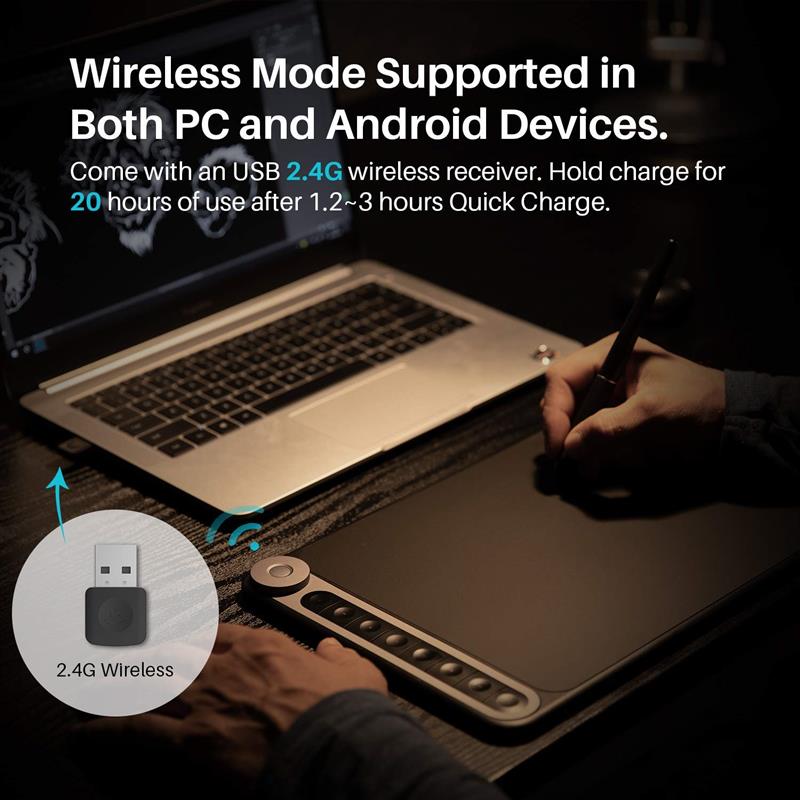 Крім унікального засобу, новий планшет оснащений і багатьма іншими функціями, здатними ефективно задовольняти потреби користувачів. Частота опитування на рівні 266PPS забезпечує можливість креслити і малювати без затримок і перерваних ліній незалежно від вашої швидкості - планшет миттєво вловлює кожен рух пера. 8192 рівня чутливості до тиску дозволяє здійснювати природний рендеринг кожної лінії за рахунок різного тиску на поверхню планшета при введенні штрихів різної товщини. Крім того, поєднання можливостей бездротового зв`язку і 20-годинної роботи від акумулятора не тільки звільняє користувачів від необхідності у численних кабелях, але і забезпечує додаткову зручність творчості - тепер ви не пропустите жоден момент натхнення. На відміну від інших цифрових продуктів, нагадують про необхідність зарядки тільки коли батарея майже на виході, світлові індикатори клавіш нового планшета відображають рівень заряду в режимі реального часу, що дозволить вам працювати на відкритому повітрі, не турбуючись про акумуляторі.