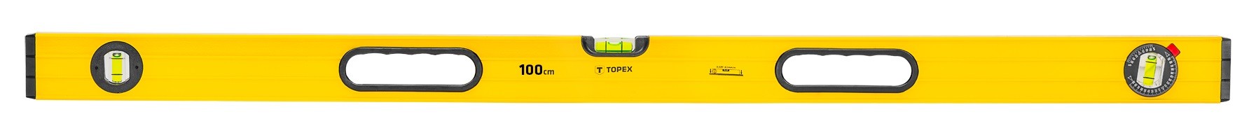 Topex 1000 мм (29C604) – високоточного вирівнювання поверхні будівельний рівень довжиною 1000 міліметрів. Похибка складає всього 0.5 мм/м. В роботі доступні три ампули. В основі корпусу рівня закладений легкий і в той же час міцний алюміній.
