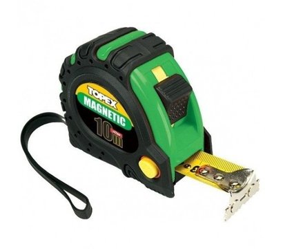 Topex 27C340 – магнітна рулетка робочої довжини 10 метрів для точного вимірювання довжини. Гнучка смуга виготовлена з міцної сталі завширшки 32 міліметри. Зовні стрічка покрита нейлон, який ефективно захищає її від зносу. Корпус рулетки виконаний в ергономічної форми, що гарантує зручне захоплення. У підтримці три фіксатора змотування стрічки, а також магнітний наконечник. В основу корпуса закладений пластик.