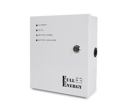 Full Energy BBG-125 – одноканальний п`яти амперний блок безперебійного живлення імпульсного типу для постачання різноманітної слабкострумової техніки з робочим напругою від 12 до 14,2 Вольта. Допустима напруга по входу коливається в межах від 100 до 240 Вольт. Підключення по входу і виходу проводиться через клемник. Блок поміщений в міцний металевий корпус з кришкою і замком. Всередині корпусу є місце під розміщення акб ємністю 1,2 Ач, 2.2 Ач, 4 Ач, 7 Ач. На допомогу йде світлодіодна індикація. Розміри: 225x195x80 міліметрів. Блок успішно виконує свою роботу в середовищі температурами в діапазоні від -20 до +60 градусів за Цельсієм. Комплект поставки включає ключі до замку боксу.