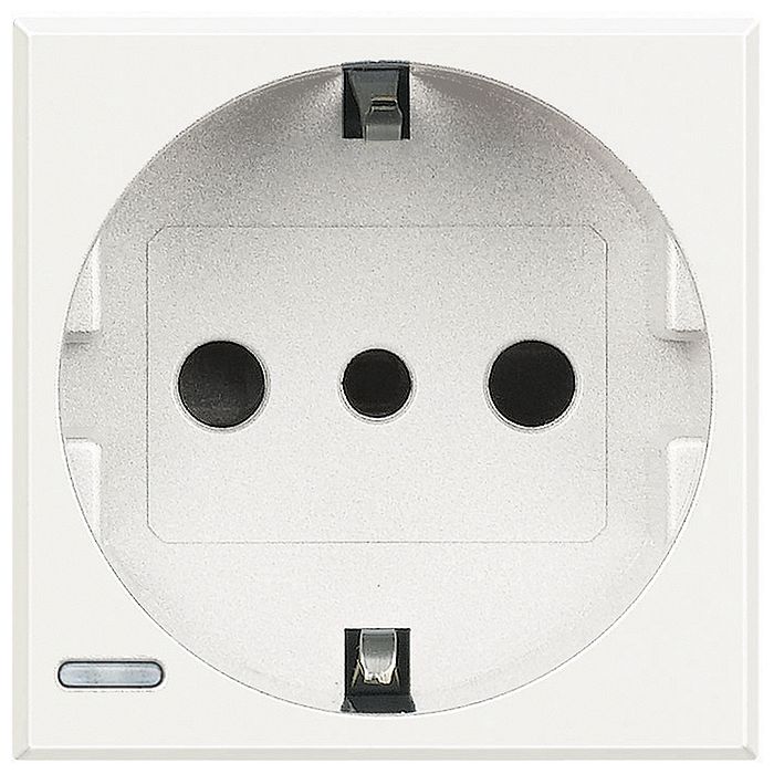 Bticino Axolute HD4140 White – одне портова побутова розетка з заземленням серії AXOLUTE в білому кольорі. Розетка розрахована на навантаження в 16 Амперів і робоча напруга 250 Вольт. Монтаж проводиться прихованим способом. Радує присутність шторок. В якості матеріалу використано композит. Клас герметичності IP20.