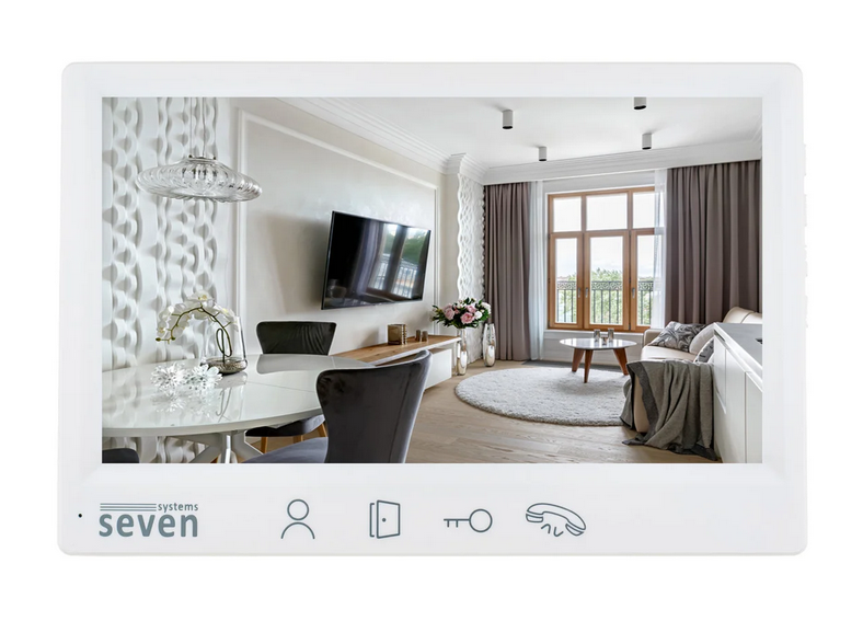 Цей пристрій від відомого виробника Seven Systems поєднує в собі лаконічний дизайн та високу надійність. Завдяки 7-дюймовому кольоровому монітору, ви отримуєте чітке зображення з панелі виклику. Білий колір корпусу дозволяє домофону органічно вписатися в інтер`єр будь-якої квартири, приватного будинку чи сучасного офісу. Використання сенсорних кнопок робить керування інтуїтивно зрозумілим та легким.