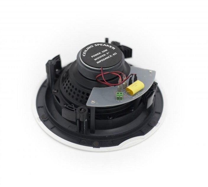 - Простий монтаж: спеціальні кріплення дозволяють надійно зафіксувати гучномовці у стелі типу «Армстронг» або гіпсокартонних конструкціях.