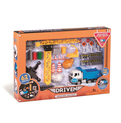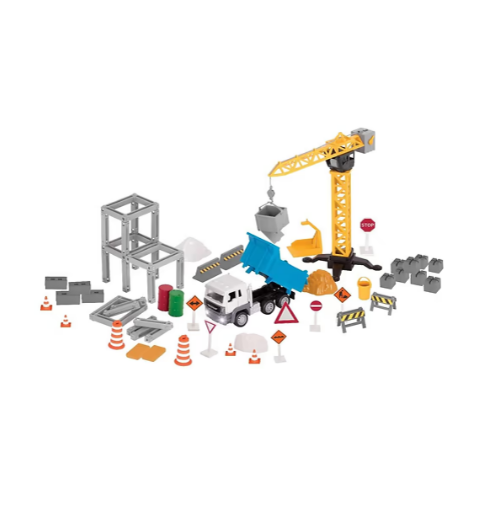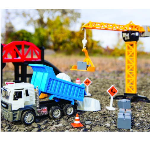 Дитина захоплюється будівельною технікою? Тоді набір «Будівельний кран» від Driven саме для неї. З цим набором можна створити безпечний будівельний майданчик з попереджувальними знаками і краном для переміщення важких вантажів. Все деталізовано і функціонально: в самоскида, що працює від батарейок типу AG13 (в комплекті), відчиняються двері, при натисканні на капот вмикаються фари, кузов піднімається, щоб вивантажити будівельні балки; кран обертається і фіксується гаком на місці. Набір містить величезний асортимент будівельних аксесуарів, наприклад балки, вивіски, знаки і будівельні матеріали. Всього в комплекті 62 предмета для того, щоб повністю відтворити процес роботи будівництва. Елементи набору виконані із якісної та міцної пластмаси. Рекомендований вік: 4+