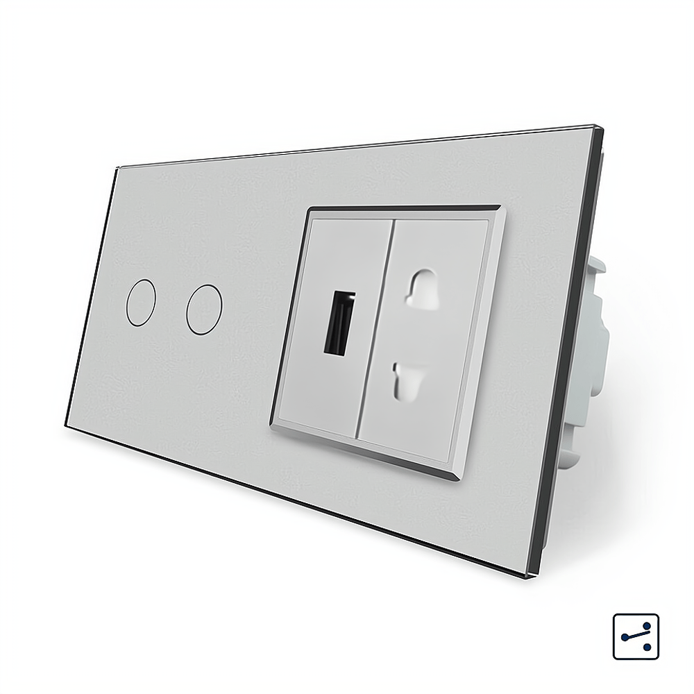 - Сенсорный проходной выключатель 2 сенсора 1 розетка 1 USB серый стекло Livolo (VL-C702S/C7USBC1A-15)