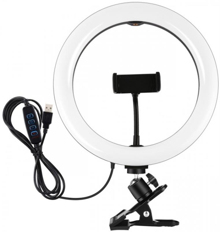 Комплектація: Кільцеве світло, кулькова головка штатива, USB-кабель з пультом керування, телефонний тримач, затискач.
