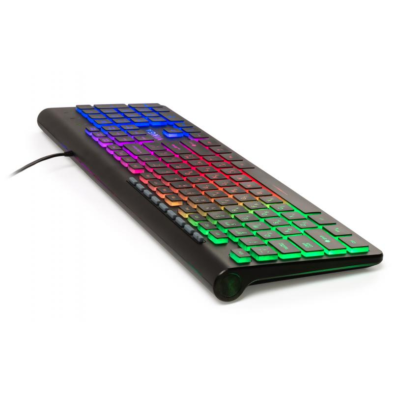 Функціонал виробу підтримує 3 мовні розкладки. На кнопках зображені українські, англійські та російські літери. Всього в моделі 104 клавіші, серед яких є повний ряд F1 - F12 і калькуляційний комплекс NumPad, а також 9 додаткових клавіш.