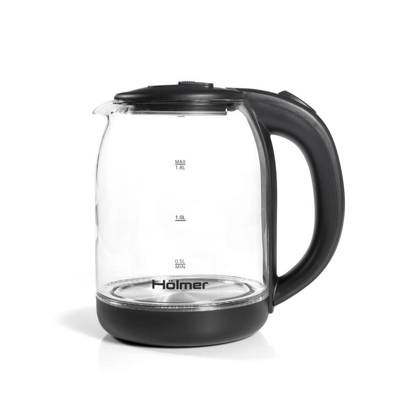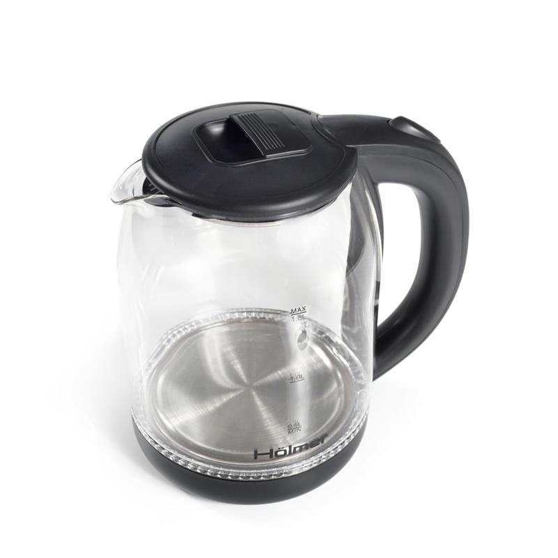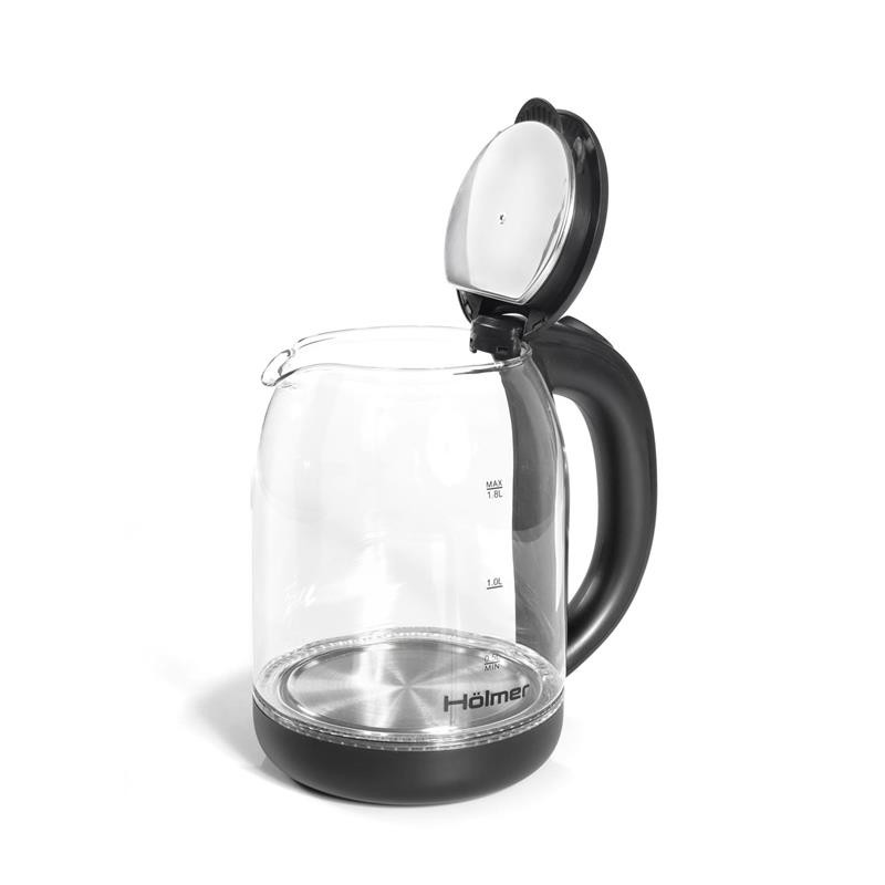 Чайник Holmer HKS-1722 має чорний колір та матове покриття, а також LED – підсвічування яке сигналізує про роботу чайника та красиво і яскраво підсвічує воду блакитним кольором.