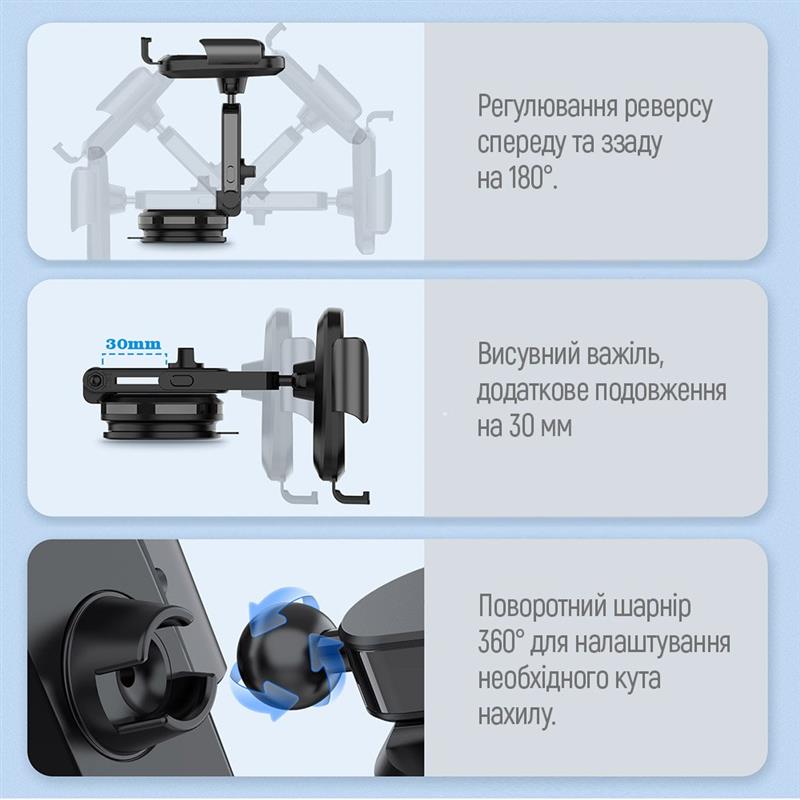Компактний дизайн, не займає багато місця і не закриває огляд Широка сумісність із мобільними апаратами, що мають діагональ екрана від 4" до 6,5" (від 6.6 см до 9 см завширшки) Виготовлений із високоякісних матеріалів Кілька ступенів захисту, включно із захистом від перенапруг