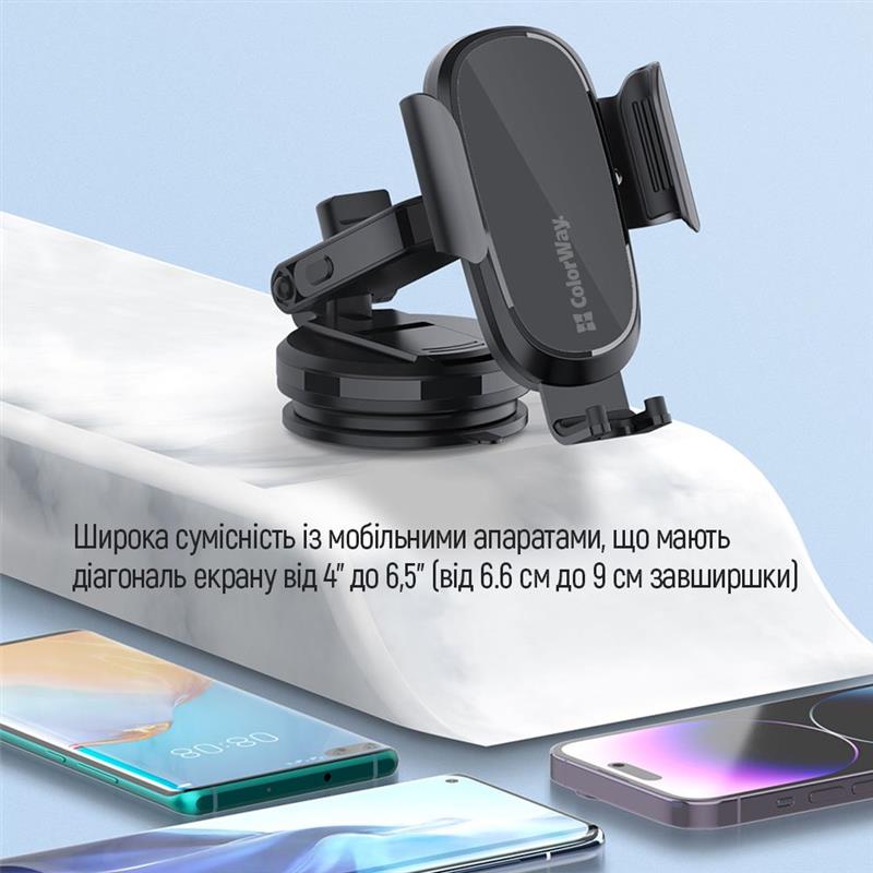 Бездротовий автомобільний зарядний пристрій ColorWay Dashboard Car Wireless Charger - має функцію бездротової, зарядки, що допоможе вам зарядити смартфон, який підтримує технологію Qi. Кріплення на панель або на лобове скло за допомогою присоски з гелевою клейкою основою і затискачем за технологією подвійного клацання. Тримач виконаний з міцного пластику та алюмінію, а конструкція дасть змогу встановити смартфон під потрібним кутом. Дизайн пристрою гармонійно вписується в будь-який автомобіль, а його універсальність підійде практично під будь-який смартфон діагоналлю від 4.7" до 6,8" (від 7.3 см до 9.5 см завширшки). Висока міцність кріплення унеможливить випадання навіть за сильного трясіння, а продумана конструкція дасть змогу використовувати функціонал телефона на всі 100%, не закриваючи водночас огляду. Механізм обертання на 360 градусів дасть змогу закріпити смартфон у зручному для Вас положенні. На додаток до можливості надійної фіксації смартфона, автомобільний тримач має вбудовану бездротову зарядку потужністю 15 Вт, що дасть змогу зарядити смартфон із високою швидкістю. Зарядний пристрій оснащений розумним чипом для захисту ваших пристроїв від короткого замикання, перенапруги, перегріву і перевантаження по струму.