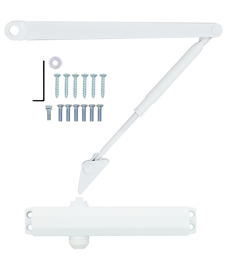 Ryobi D-2055V BC STD глянсовий білий є довгим служити і надійним інструментом, сертифікованими до EN 1154, ефективно Виконуючи функцію автоматичного закриття відкритих дверей. Модель цього класу 3/4/5 з колінним тяги підлягає верхньому монтажу і призначений для внутрішніх і зовнішніх дверей загальною вагою до 100 кілограмів і шириною до 1250 міліметрів. Важливо відзначити можливість монтажу таких дверей на пожежні двері з границю вогнестійкості 60 хв.