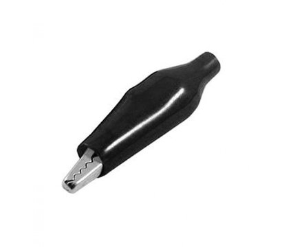 Невеликий кліп для "крокодилової" тестери з пластмасовою ізоляцією, 44 міліметрів завдовжки і чорним. Кліп реалізує миттєве з`єднання проводів під час електромонтажних або вимірювальних робіт.