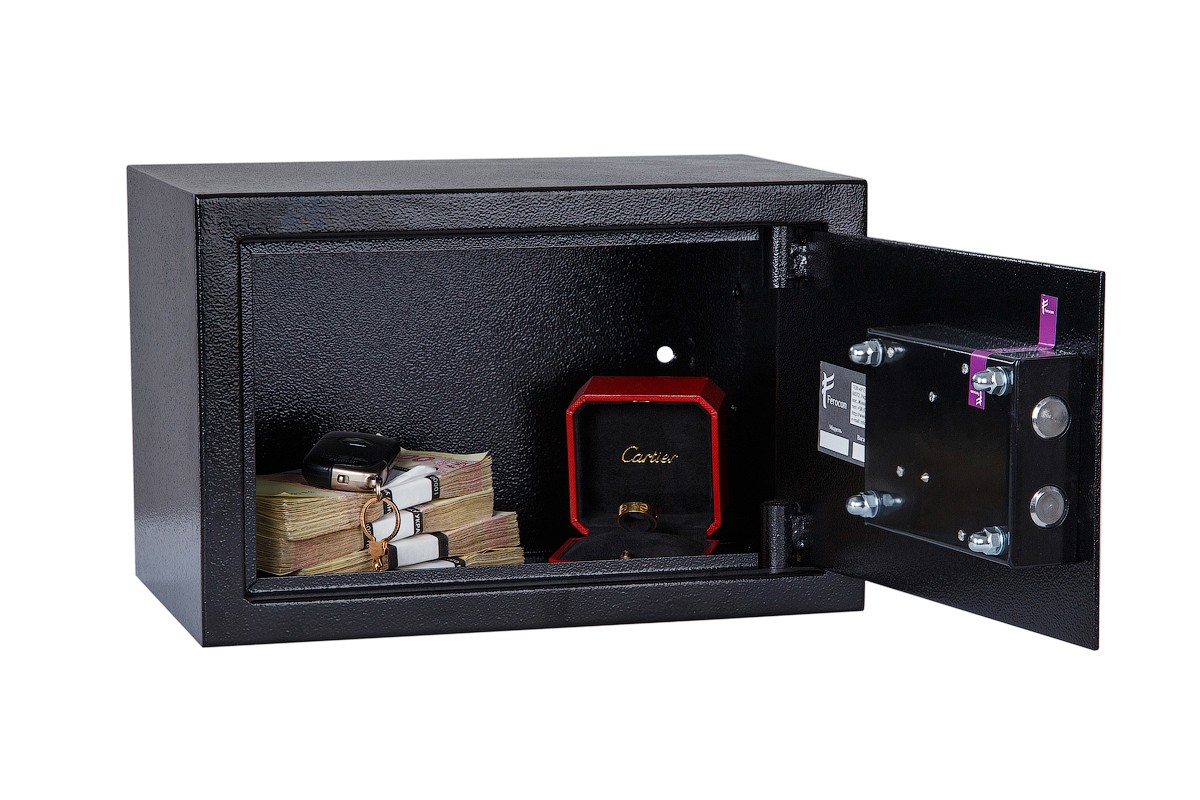 Ferocon BS-25K. 9005-компактний сейф високоякісної сталі, що спеціалізується головним чином на зберіганні цінних документів, дрібних особистих речей і дрібних грошей. Кріплення сейфа можливе як в підлозі, так і в стіні за рахунок анкерних кріплень. Один ключ блокування з двома установок використовується для безпечного закріплення дверей. Сейф в цілому служить надійним рішенням для обмеження доступу до цінностей. Додатковий шар захисту від злому дає внутрішнє розміщення петель. Відкриття дверей на 100 градусів дає додатковий комфорт для розміщення і видалення речей. Комплект поставки містить два ключі.