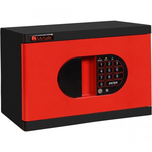 MySafe MS.17.E Red червоний є дуже надійним і елегантним меблям безпечного нового покоління серії містики на основі запатентованої системи закриття дверей і анти-злий дизайн. З огляду на його розмір призначений для безпечного зберігання дрібних цінностей. Підставою корпусу була суцільна металева товщина двох міліметрів. Точно така ж товщина металу на дверях. Фіксація дверей-це код електронного замка, який активує дві хромовані поворотна установки діаметром 25 міліметрів. Внутрішнє розміщення протирізак петель також дає надійність. Є опорні вузли для кріплення під стіну і підлогу.